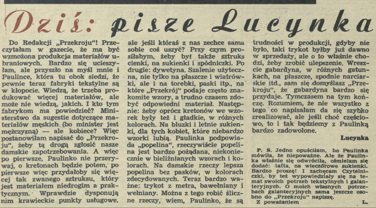 Archiwum / Dziś Lucynka i Paulinka nr 452 (49/1953) 20/28 Podziel się Tytuł Dziś: pisze Lucynka Autor Lucynka Rubryka Dziś Lucynka i Paulinka Artykuł z numeru 452 (49/1953) Data wydania 6 grudnia 1953 Tagi szycie ubranie krawiectwo tekstylia materiał
