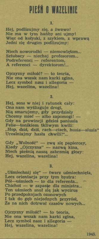 Archiwum / Poezja nr 486 (31/1954) 09/52 Podziel się Tytuł Pieśń o wazelinie Autor Janusz Minkiewicz Kategoria Poezja Artykuł z numeru 486 (31/1954) Data wydania 1 sierpnia 1954 Tagi wiersz "Wiersze wybrane"