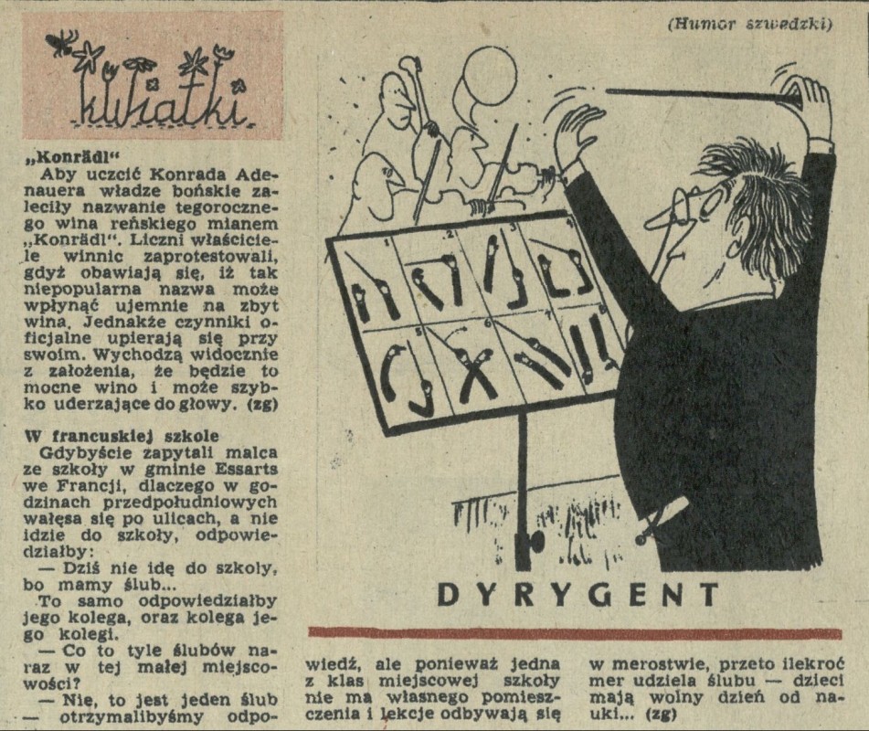 Archiwum / Kwiatki nr 452 (49/1953) 22/44 Podziel się Tytuł Kwiatki Rubryka Kwiatki Artykuł z numeru 452 (49/1953) Data wydania 6 grudnia 1953 Tagi ciekawostki Niemcy Adenauer wino Francja szkoła