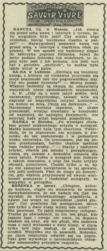 Archiwum / Demokratyczny savoir-vivre nr 489 (34/1954) 33/51 Podziel się Tytuł Demokratyczny savoir-vivre Autor Jan Kamyczek Rubryka Demokratyczny savoir-vivre Artykuł z numeru 489 (34/1954) Data wydania 22 sierpnia 1954 Tagi obyczaje kultura