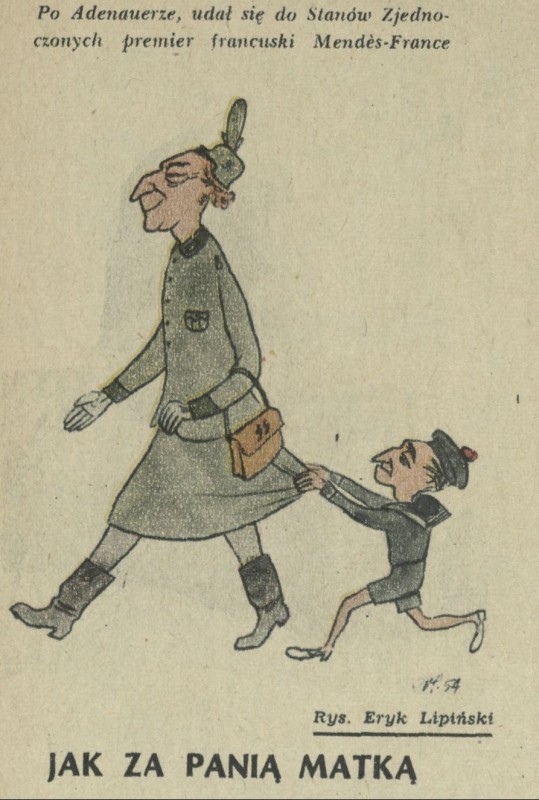 Archiwum / Rozmaitości [old] nr 501 (46/1954) 55/61 Podziel się Tytuł Jak za panią matką Autor Eryk Lipiński Rubryka Rozmaitości [old] Artykuł z numeru 501 (46/1954) Data wydania 14 listopada 1954 Tagi satyra polityka propaganda karykatura Adenauer Francja Mendes-France USA