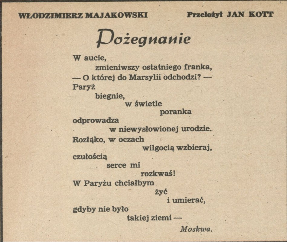 Archiwum / Poezja nr 140 (50/1947) 46/1638 Podziel się Tytuł Pozegnanie Autor Włodzimierz Majakowski Kategoria Poezja Artykuł z numeru 140 (50/1947) Data wydania 14 grudnia 1947 Tagi Moskwa