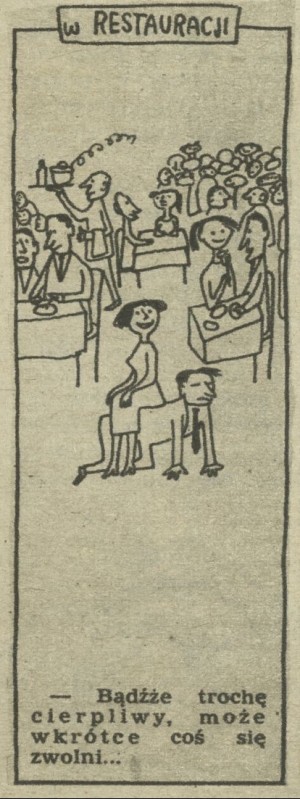 Archiwum / Historyjki obrazkowe nr 520 (13/1955) 19643/123969 Podziel się Tytuł W restauracji Autor Marian Eile Kategoria Historyjki obrazkowe Artykuł z numeru 520 (13/1955) Data wydania 17 marca 1955 Tagi żart rysunkowy stolik cierpliwość
