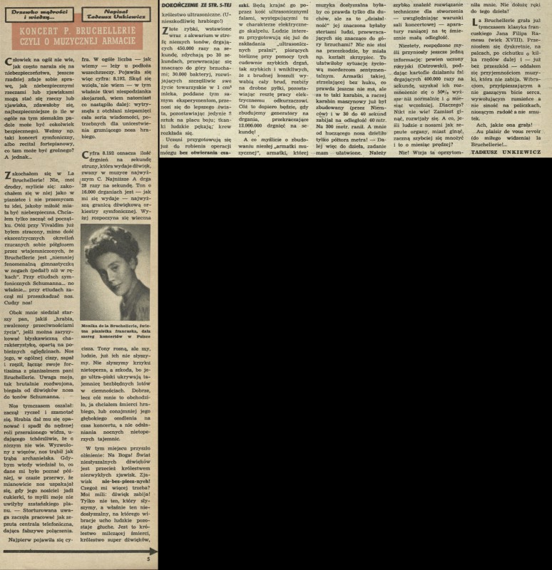 Archiwum / Drzewko mądrości nr 140 (50/1947) 04/15 Podziel się Tytuł Koncert p. Bruchollerie czyli o muzycznej armacie Autor Tadeusz Unkiewicz Rubryka Drzewko mądrości Artykuł z numeru 140 (50/1947) Data wydania 14 grudnia 1947 Tagi Monique de La Bruchollerie muzyka dźwięk ultradźwięki infradźwięki