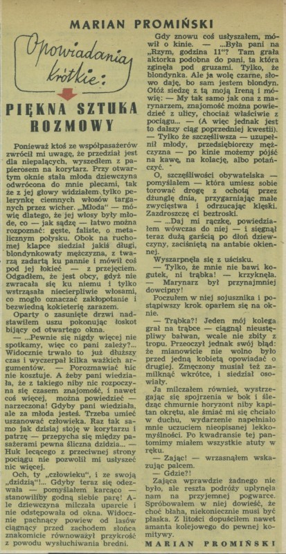 Archiwum / Opowiadania krótkie Mariana Podkowińskiego nr 481 (26/1954) 04/10 Podziel się Tytuł Piękna sztuka rozmowy Autor Marian Promiński Rubryka Opowiadania krótkie Mariana Podkowińskiego Artykuł z numeru 481 (26/1954) Data wydania 27 czerwca 1954 Tagi krótkie opowiadania