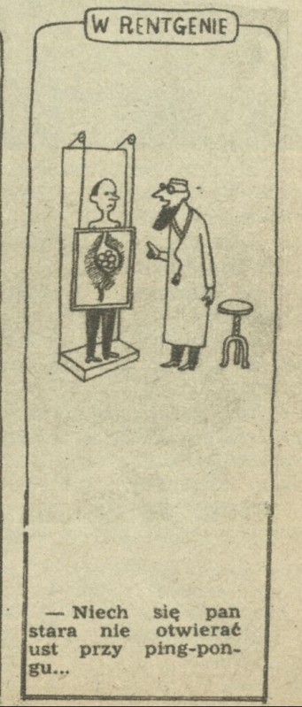 Archiwum / Historyjki obrazkowe nr 537 (30/1955) 391/722 Podziel się Tytuł W rentgenie Autor Marian Eile Kategoria Historyjki obrazkowe Artykuł z numeru 537 (30/1955) Data wydania 22 lipca 1955 Tagi żart rysunkowy ping pong prześwietlenie