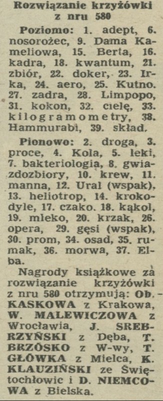 Archiwum / Krzyżówka nr 583 (24/1956) 09/69 Podziel się Tytuł Rozwiązanie krzyżówki z nru 580 Rubryka Krzyżówka Artykuł z numeru 583 (24/1956) Data wydania 10 czerwca 1956