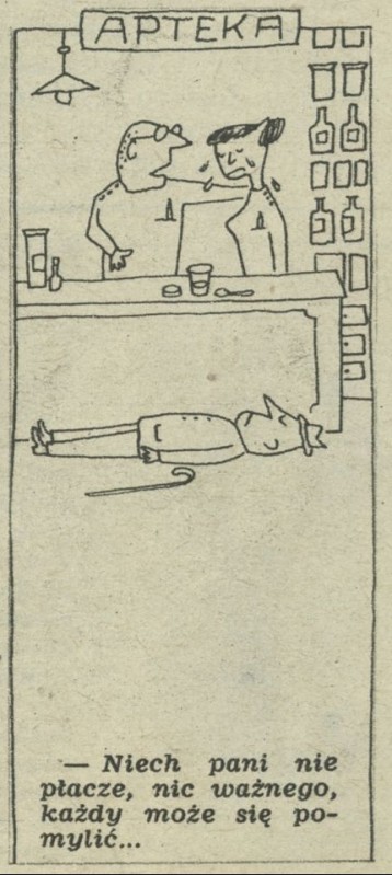 Archiwum / Historyjki obrazkowe nr 600 (41/1956) 23409/123969 Podziel się Tytuł Apteka Autor Marian Eile Kategoria Historyjki obrazkowe Artykuł z numeru 600 (41/1956) Data wydania 7 października 1956 Tagi żart rysunkowy