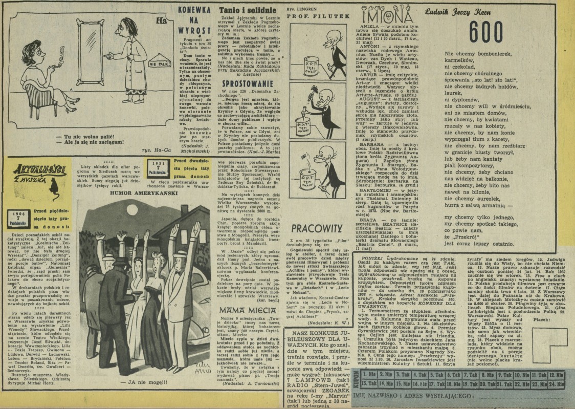 Archiwum / Rozmaitości nr 600 (41/1956) 23419/123969 Podziel się Tytuł Rozmaitości Rubryka Rozmaitości Artykuł z numeru 600 (41/1956) Data wydania 7 października 1956