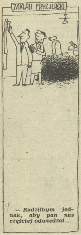 Archiwum / Historyjki obrazkowe nr 606 (47/1956) 9/9 Podziel się Tytuł Zakład fryzjerski Autor Marian Eile Kategoria Historyjki obrazkowe Artykuł z numeru 606 (47/1956) Data wydania 18 listopada 1956 Tagi żart rysunkowy fryzjer włosy