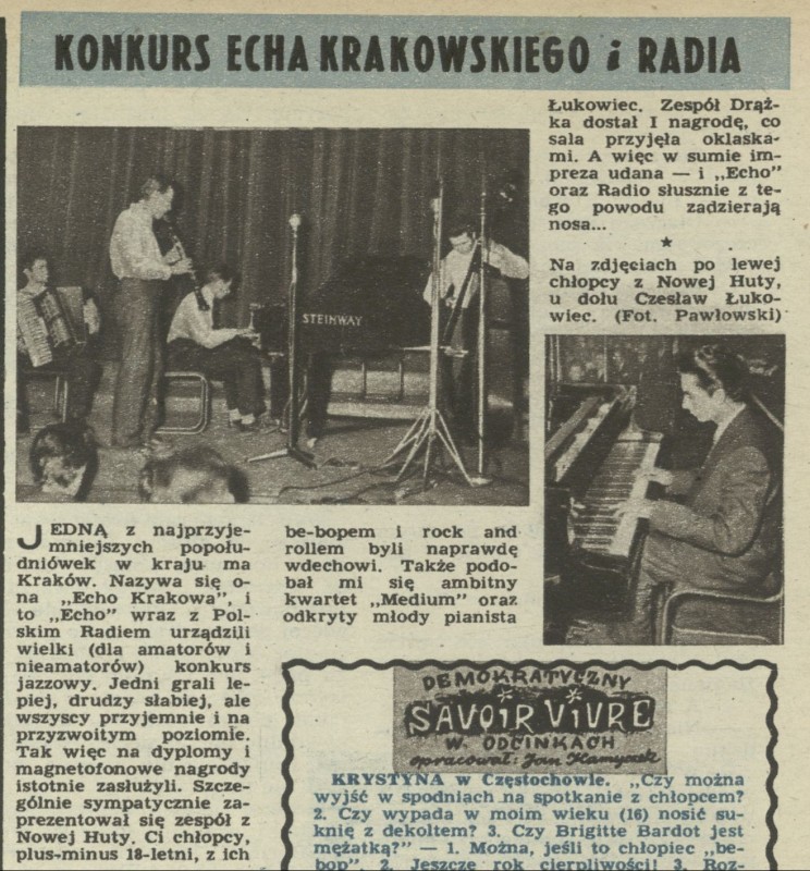Archiwum / Różności nr 618 (07/1957) 13/190 Podziel się Tytuł Konkurs „Echa Krakowskiego” i Radia Kategoria Różności Artykuł z numeru 618 (7/1957) Data wydania 10 lutego 1957 Tagi Polskie Radio konkurs jazzowy