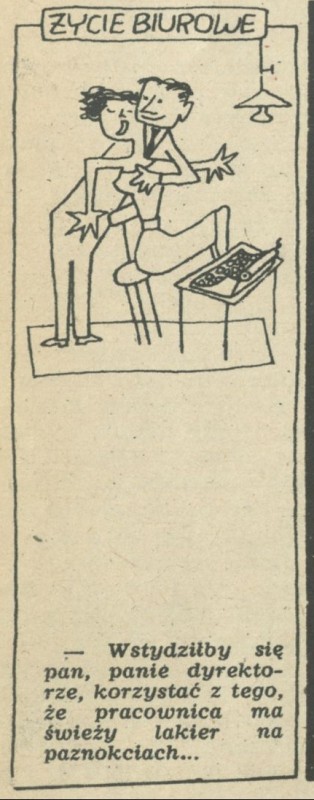 Archiwum / Historyjki obrazkowe nr 619 (08/1957) 24274/123969 Podziel się Tytuł Życie biurowe Autor Marian Eile Kategoria Historyjki obrazkowe Artykuł z numeru 619 (8/1957) Data wydania 17 lutego 1957 Tagi żart rysunkowy lakier paznokcie