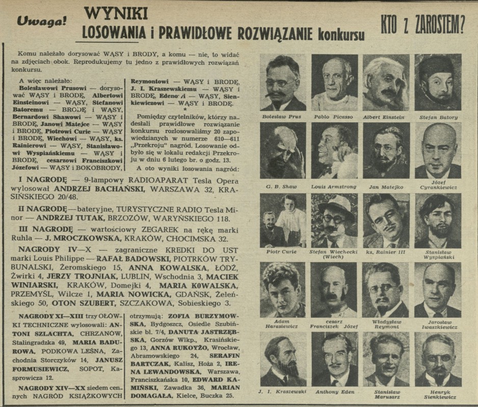 Archiwum / Konkurs nr 620 (09/1957) 24318/123969 Podziel się Tytuł Wyniki konkursu „Kto z zarostem?” Rubryka Konkurs Artykuł z numeru 620 (9/1957) Data wydania 24 lutego 1957 Tagi wąsy broda