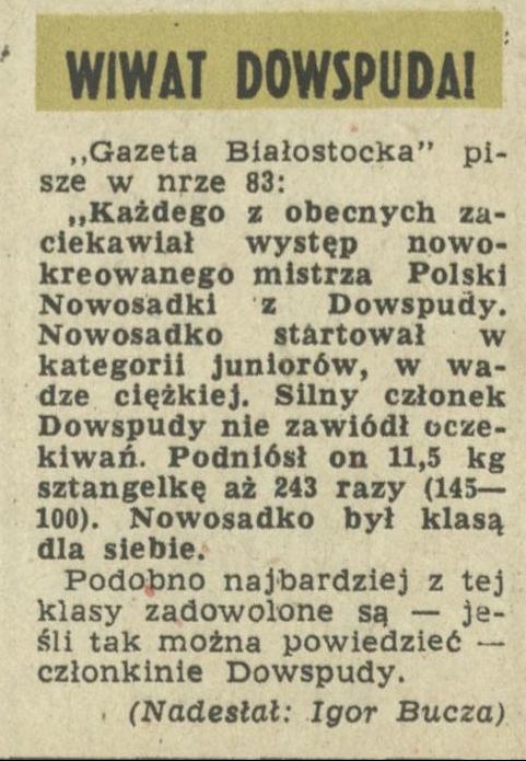 Archiwum / Rozmaitości [old] nr 629 (18/1957) 12/18 Podziel się Tytuł Wiwat Dowspuda! Rubryka Rozmaitości [old] Artykuł z numeru 629 (18/1957) Data wydania 28 kwietnia 1957 Tagi waga ciężka siłacz Nowosadko