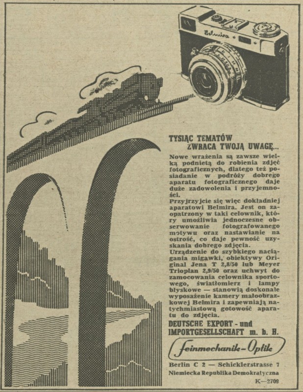 Archiwum / Reklamy nr 638 (27/1957) 25285/123969 Podziel się Tytuł Feinmechanik - Optik Rubryka Reklamy Artykuł z numeru 638 (27/1957) Data wydania 30 czerwca 1957 Tagi aparat fotograficzny