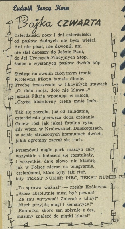 Archiwum / Rozmaitości [old] nr 647 (36/1957) 25806/123969 Podziel się Tytuł Bajka czwarta Rubryka Rozmaitości [old] Artykuł z numeru 647 (36/1957) Data wydania 1 września 1957 Tagi wiersz fikcja