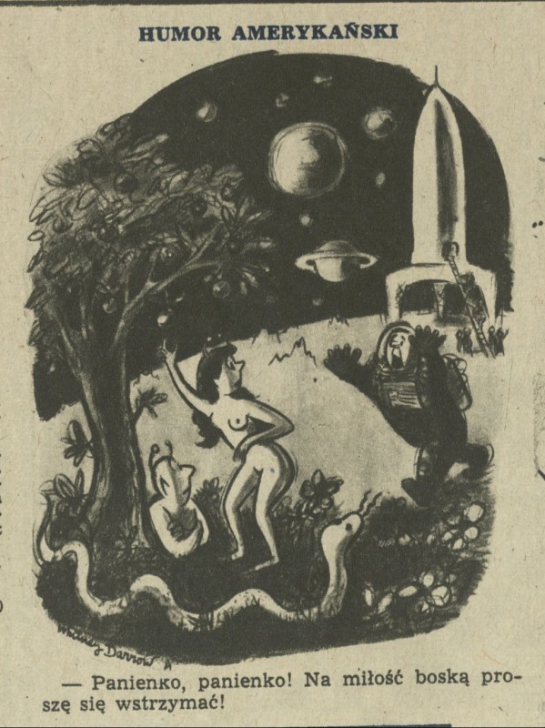 Archiwum / Humor (włoski, francuski, amerykański…) nr 647 (36/1957) 25809/123969 Podziel się Tytuł Humor amerykański Rubryka Humor (włoski, francuski, amerykański…) Artykuł z numeru 647 (36/1957) Data wydania 1 września 1957 Tagi żart rysunkowy adam i ewa jabłko raj eden