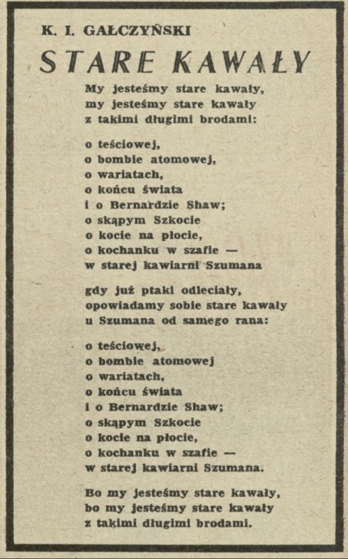 Archiwum / Poezja nr 186 (44/1948) 22/894 Podziel się Tytuł Stare kawały Autor Konstanty Ildefons Gałczyński Kategoria Poezja Artykuł z numeru 186 (44/1948) Data wydania 31 października 1948