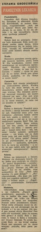 Archiwum / Opowiadanie nr 186 (44/1948) 161/217 Podziel się Tytuł Pamiętnik lekarza Autor Stefania Grodzieńska Kategoria Opowiadanie Artykuł z numeru 186 (44/1948) Data wydania 31 października 1948