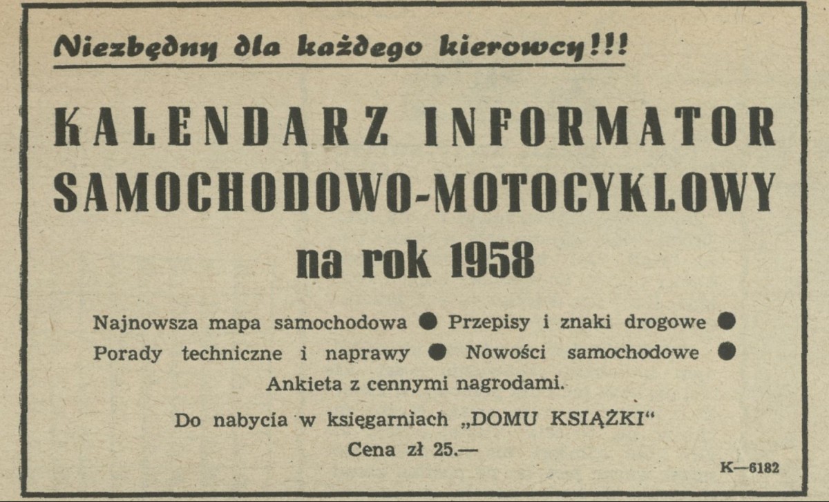 Archiwum / Reklamy nr specjalny 51/1957 66/3043 Podziel się Tytuł Kalendarz informator samochodowo-motocyklowy na rok 1958 Rubryka Reklamy Artykuł z numeru nr specjalny 51/1957 Data wydania 15 grudnia 1957