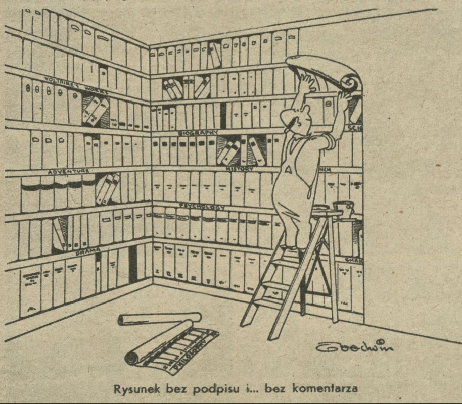 Archiwum / Rysunek nr 147 (05/1948) 4330/123969 Podziel się Tytuł Rysunek bez podpisu i... bez komentarza Kategoria Rysunek Artykuł z numeru 147 (5/1948) Data wydania 1 lutego 1948 Tagi żart rysunkowy biblioteka tapeta