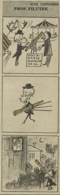 Archiwum / Profesor Filutek nr 168 (26/1948) 361/495 Podziel się Tytuł Prof. Filutek Autor Zbigniew Lengren Rubryka Profesor Filutek Artykuł z numeru 168 (26/1948) Data wydania 27 czerwca 1948 Tagi żart rysunkowy teleskop