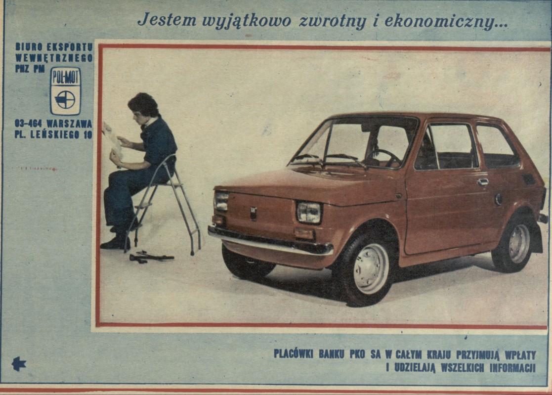 Archiwum / Reklamy nr 1732 (25/1978) 4/6 Podziel się Tytuł Jestem wyjątkowo zwroty i ekonomiczny... Rubryka Reklamy Artykuł z numeru 1732 (25/1978) Data wydania 18 czerwca 1978 Tagi Bank PKO maluch samochód fiat 125p