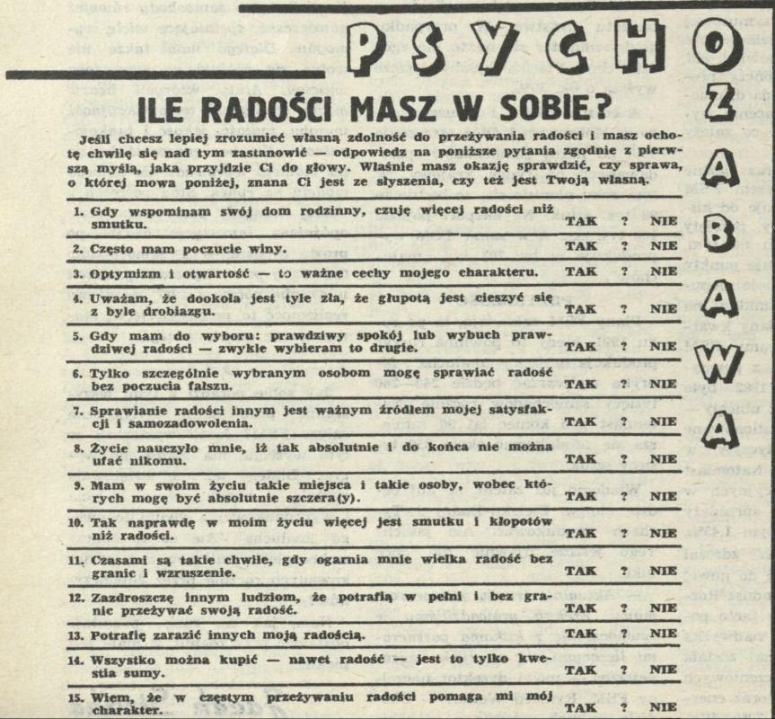 Archiwum / Psychozabawa nr 2192 (24/1987) 3/6 Podziel się Tytuł Ile radości masz w sobie? Autor Leszek Mellibruda Rubryka Psychozabawa Artykuł z numeru 2192 (24/1987) Data wydania 14 czerwca 1987