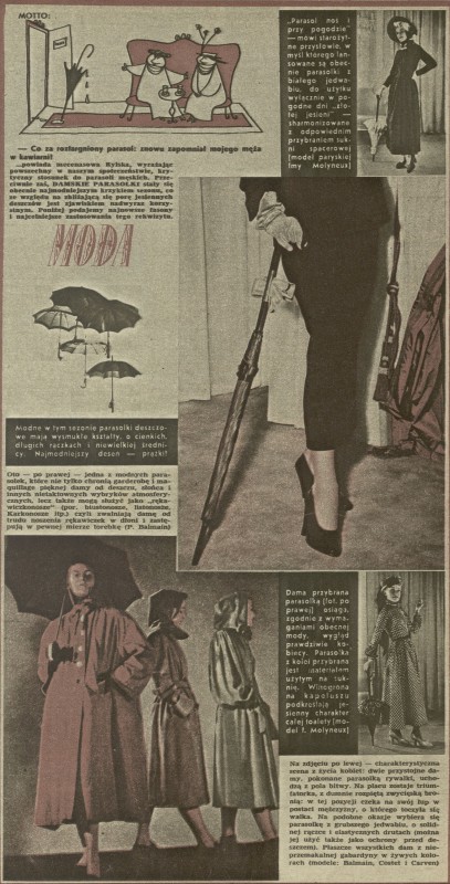 Archiwum / Moda nr 176 (34/1948) 2/6 Podziel się Tytuł Moda Rubryka Moda Artykuł z numeru 176 (34/1948) Data wydania 22 sierpnia 1948 Tagi moda damska moda jesienna parasolki mecenasowa Rylska moda paryska