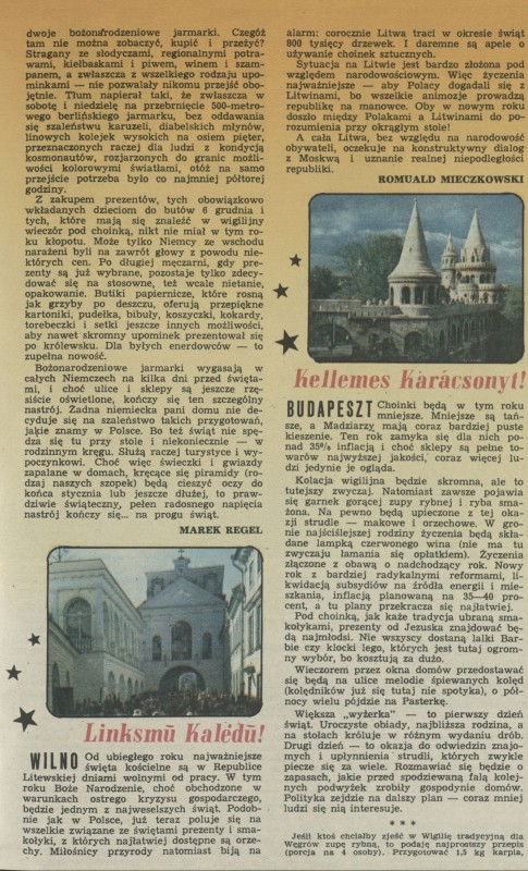 Archiwum / korespondencja własna "Przekroju" nr 2374-75 (23-23/1990) 224/271 Podziel się Tytuł Wilno: Linksmu Kaledu! Autor Romuald Mieczkowski Rubryka korespondencja własna "Przekroju" Artykuł z numeru 2374-75 (2375/1990) Data wydania 23 grudnia 1990 Tagi Święta Bożego Narodzenia