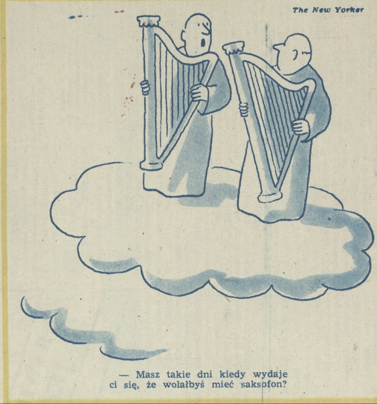 Archiwum / Rysunki z magazynu The New Yorker nr 1681 (26/1977) 70511/123969 Podziel się Tytuł - Masz takie dni kiedy wydaje ci się, że wolałbyś mieć saksofon? Autor The New Yorker Rubryka Rysunki z magazynu The New Yorker Artykuł z numeru 1681 (26/1977) Data wydania 26 czerwca 1977 Tagi żart rysunkowy humor amerykański anioł harfa
