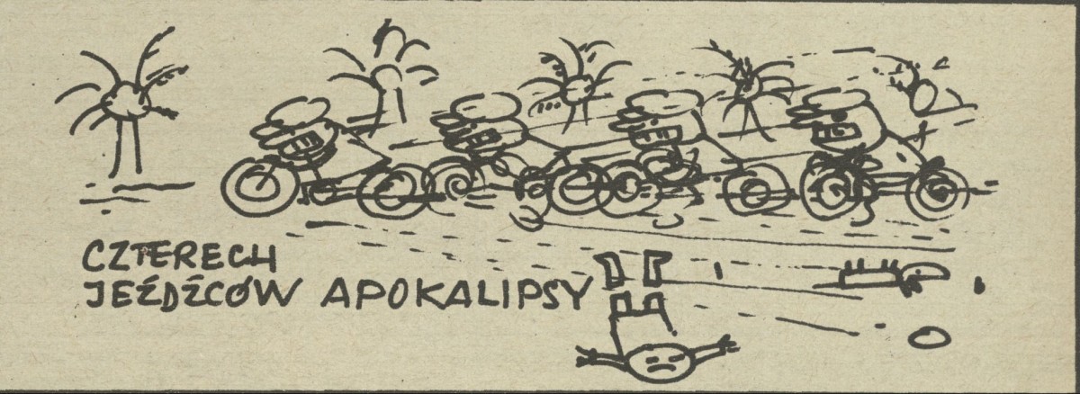 Archiwum / Przez okulary Sławomira Mrożka nr 922 (49/1962) 32/34 Podziel się Tytuł Czterech Jeźdźców Apokalipsy Autor Sławomir Mrożek Rubryka Przez okulary Sławomira Mrożka Artykuł z numeru 922 (49/1962) Prawa Diogenes Verlag AG Data wydania 9 grudnia 1962 Tagi satyra absurd żart rysunkowy motocykle