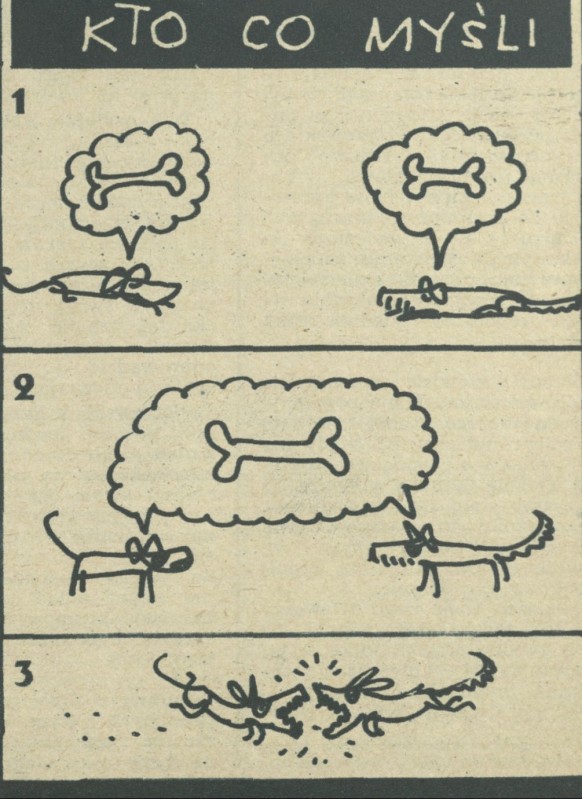 Archiwum / Przez okulary Sławomira Mrożka nr 933 (08/1963) 84850/123969 Podziel się Tytuł Kto co myśli - Psy Autor Sławomir Mrożek Rubryka Przez okulary Sławomira Mrożka Artykuł z numeru 933 (8/1963) Prawa Diogenes Verlag AG Data wydania 24 lutego 1963 Tagi satyra absurd żart rysunkowy kość