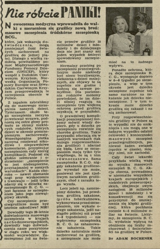 Archiwum / Reportaż nr 203 (09/1949) 83/646 Podziel się Tytuł nie robcie paniki! Autor Adam Dr. Bochenek Kategoria Reportaż Artykuł z numeru 203 (9/1949) Data wydania 27 lutego 1949 Tagi szczepionki
