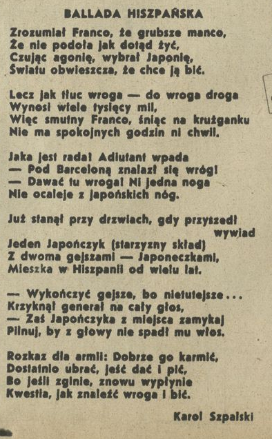 Archiwum / Fraszki nr 3 (03/1945) 65/7652 Podziel się Tytuł Ballada hiszpańska Autor Karol Szpalski Rubryka Fraszki Artykuł z numeru 3 (3/1945) Data wydania 29 kwietnia 1945