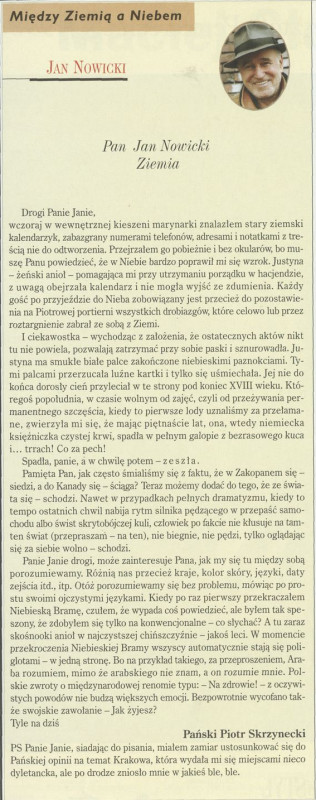 Archiwum / Felieton nr 2754 (27/1998) 5487/121061 Podziel się Tytuł Między Ziemią a Niebem Autor Jan Nowicki Piotr Skrzynecki Kategoria Felieton Artykuł z numeru 2754 (2755/1998) Data wydania 5 kwietnia 1998