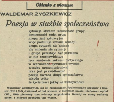 Archiwum / Okienko z wierszem nr 1872 (08/1981) 12/138 Podziel się Tytuł Okienko z wierszem: Poezja w służbie społeczeństwa Autor Waldemar Żyszkiewicz Rubryka Okienko z wierszem Artykuł z numeru 1872 (8/1981) Data wydania 22 lutego 1981 Tagi wiersz