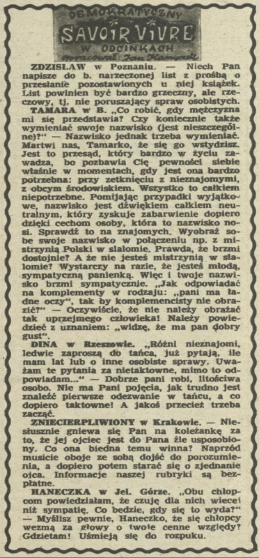 Archiwum / Demokratyczny savoir-vivre nr 495 (40/1954) 39/50 Podziel się Tytuł Demokratyczny savoir-vivre Autor Jan Kamyczek Rubryka Demokratyczny savoir-vivre Artykuł z numeru 495 (40/1954) Data wydania 3 października 1954 Tagi obyczaje kultura