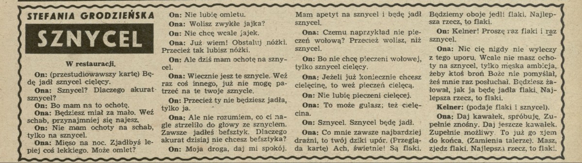Archiwum / Rozrywka nr 185 (43/1948) 158/217 Podziel się Tytuł Sznycel Autor Stefania Grodzieńska Kategoria Rozrywka Artykuł z numeru 185 (43/1948) Data wydania 24 października 1948