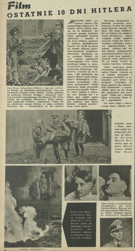 Archiwum / Film nr 517 (10/1955) 19522/123969 Podziel się Tytuł Ostatnie 10 dni Hitlera Autor Match Paris Rubryka Film Artykuł z numeru 517 (10/1955) Data wydania 6 marca 1955 Tagi "Ostatni akt" Pabst Braun Albin Skoda Willy Krause