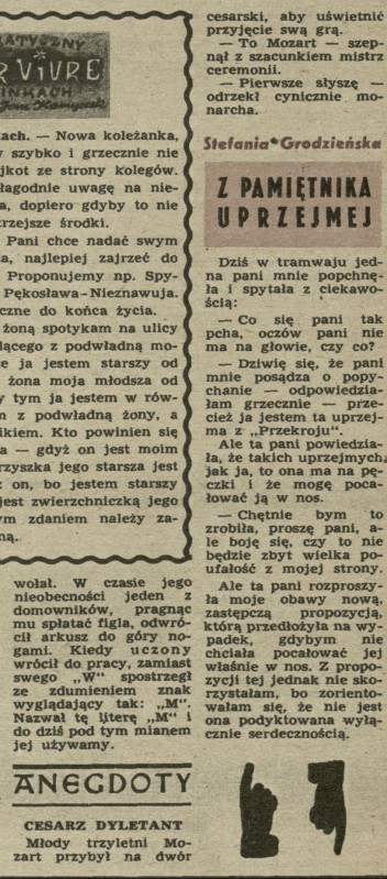 Archiwum / Różności nr 342 (44/1951) 54/58 Podziel się Tytuł Anegdoty Kategoria Różności Artykuł z numeru 342 (44/1951) Data wydania 18 października 1951 Tagi Mozart
