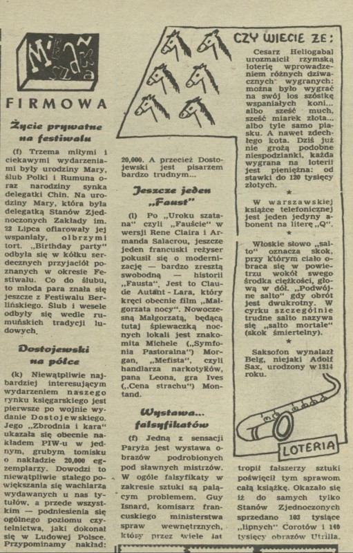 Archiwum / Mieszanka firmowa nr 541 (34/1955) 268/415 Podziel się Tytuł Mieszanka firmowa Rubryka Mieszanka firmowa Artykuł z numeru 541 (34/1955) Data wydania 21 sierpnia 1955 Tagi PIW Paryż