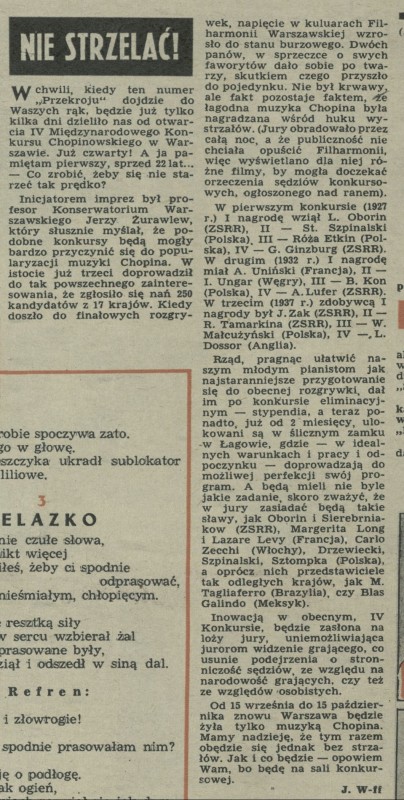 Archiwum / Rozmaitości [old] nr 231 (37/1949) 40/57 Podziel się Tytuł Nie strzelać! Autor Jerzy Waldorff Rubryka Rozmaitości [old] Artykuł z numeru 231 (37/1949) Data wydania 11 września 1949 Tagi Fryderyk Chopin Międzynarodowy Konkurs Chopinowski