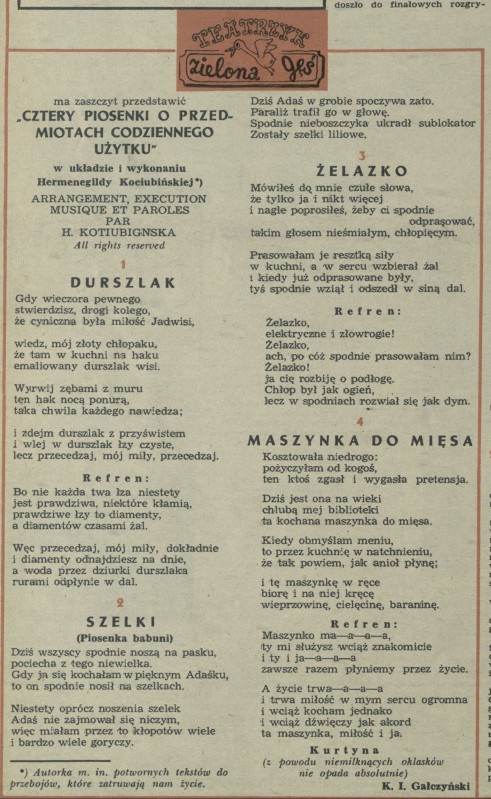 Archiwum / Teatrzyk Zielona Gęś nr 231 (37/1949) 7107/123969 Podziel się Tytuł Cztery piosenki o przedmiotach odziennego użytku Autor Konstanty Ildefons Gałczyński Rubryka Teatrzyk Zielona Gęś Artykuł z numeru 231 (37/1949) Data wydania 11 września 1949 Tagi groteska humor scenka rodzajowa gag
