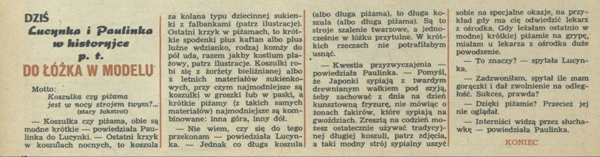 Archiwum / Dziś Lucynka i Paulinka nr 570 (11/1956) 101969/123969 Podziel się Tytuł Do łóżka w modelu Autor Lucynka i Paulinka Rubryka Dziś Lucynka i Paulinka Artykuł z numeru 570 (11/1956) Data wydania 11 marca 1956 Tagi piżama koszulka noc