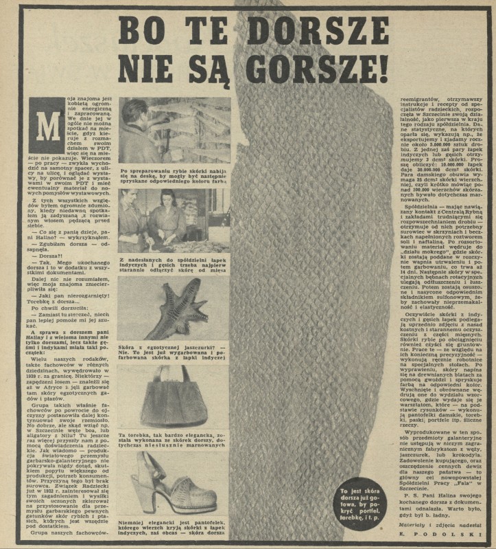 Archiwum / Artykuł nr 240 (46/1949) 7405/123969 Podziel się Tytuł Bo te dorsze nie są gorsze! Autor E. Podolski Kategoria Artykuł Artykuł z numeru 240 (46/1949) Data wydania 13 listopada 1949 Tagi skóra