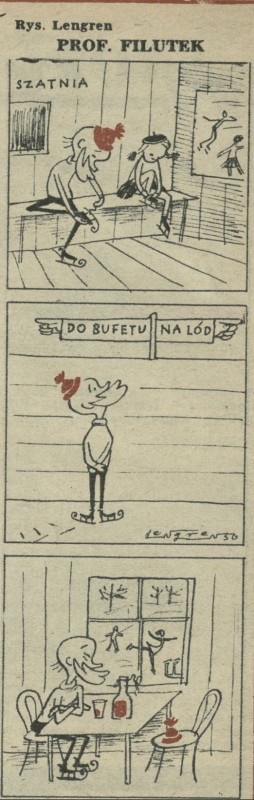 Archiwum / Profesor Filutek nr 252 (06/1950) 167/2446 Podziel się Tytuł Prof. Filutek Autor Zbigniew Lengren Rubryka Profesor Filutek Artykuł z numeru 252 (6/1950) Data wydania 3 lutego 1950 Tagi żart rysunkowy bufet lód łyżwy