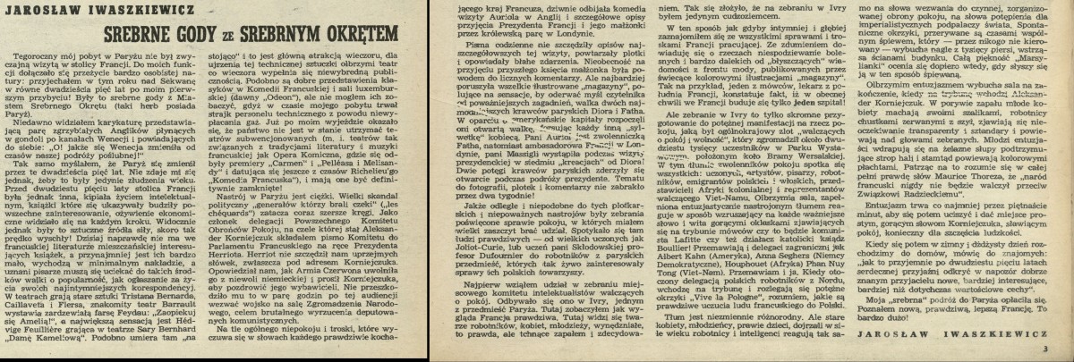 Archiwum / Felieton nr 263 (17/1950) 08/358 Podziel się Tytuł Srebrne gody ze srebrnym okrętem Autor Jarosław Iwaszkiewicz Kategoria Felieton Artykuł z numeru 263 (17/1950) Data wydania 23 kwietnia 1950 Tagi Paryż Francja Ivry Powszechny Komitet Obrońców Pokoju skandal polityka