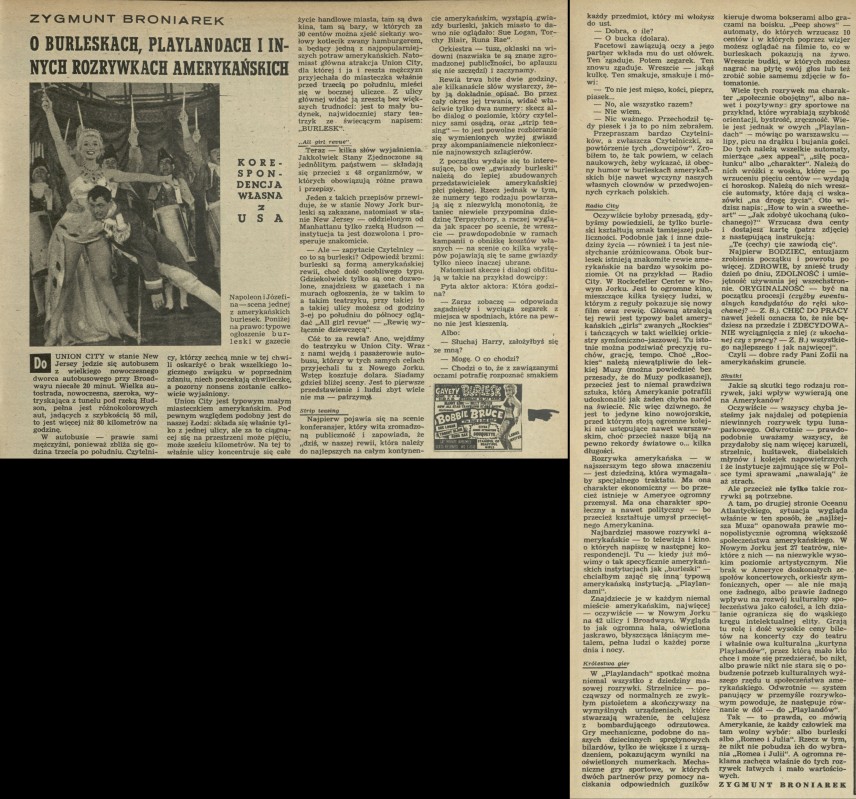 Archiwum / korespondencja własna "Przekroju" nr 565 (06/1956) 21712/123969 Podziel się Tytuł O burleskach, playlandach i innych rozrywkach amerykańskich Autor Zygmunt Broniarek Rubryka korespondencja własna "Przekroju" Artykuł z numeru 565 (6/1956) Data wydania 5 lutego 1956 Tagi USA burleska rozrywka