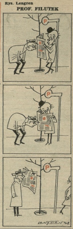 Archiwum / Profesor Filutek nr 264 (18/1950) 182/2446 Podziel się Tytuł Prof. Filutek Autor Zbigniew Lengren Rubryka Profesor Filutek Artykuł z numeru 264 (18/1950) Data wydania 1 maja 1950 Tagi żart rysunkowy przystanek gazeta
